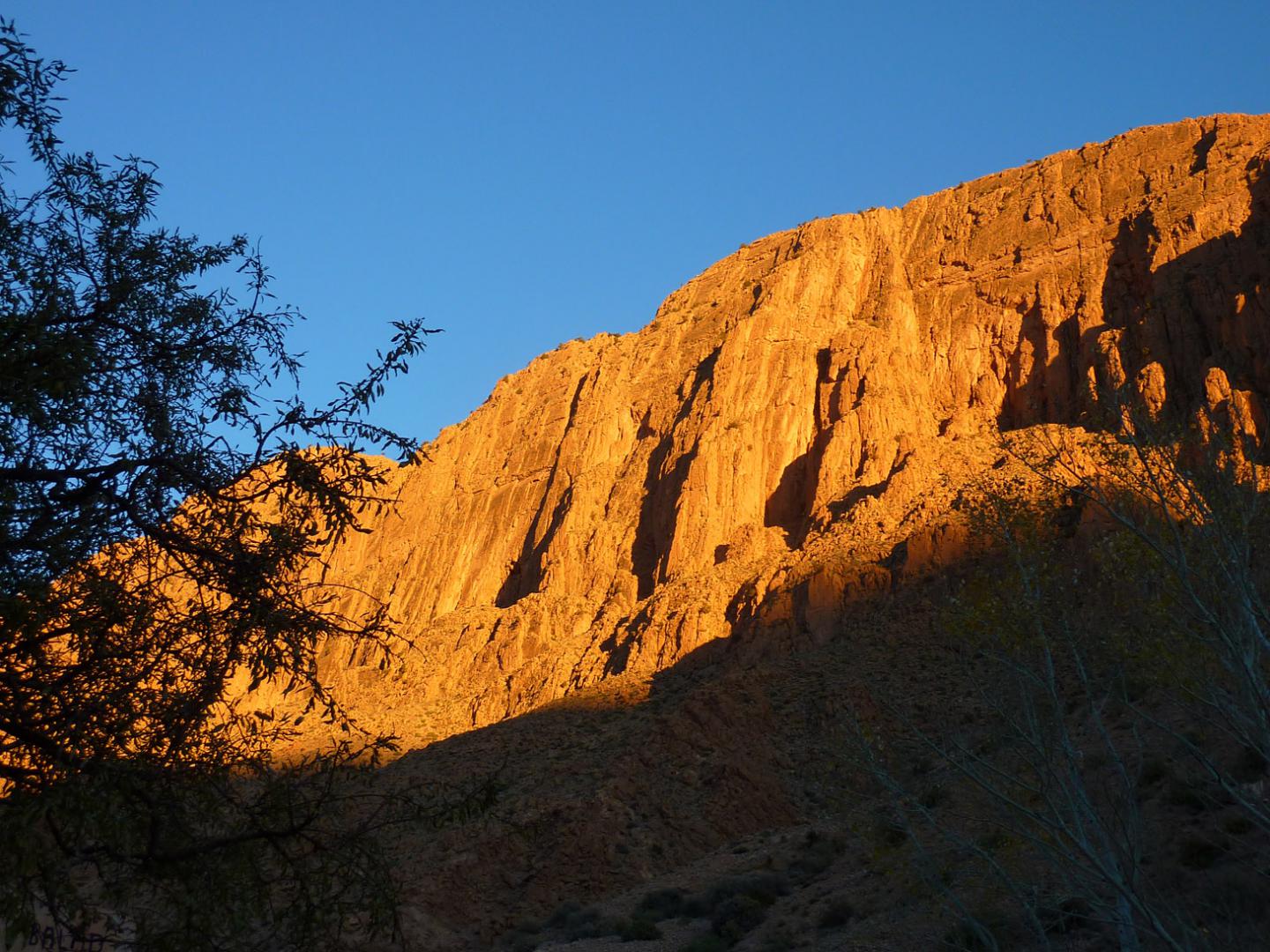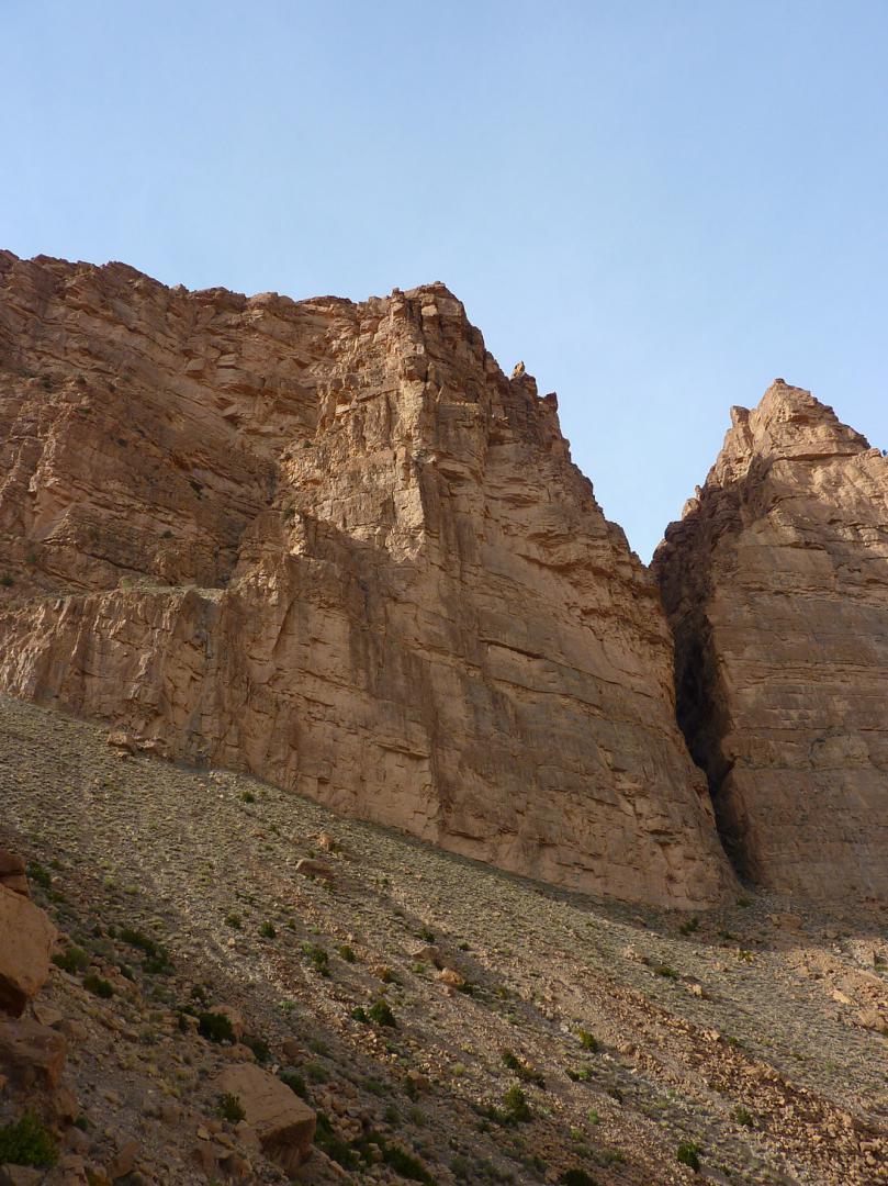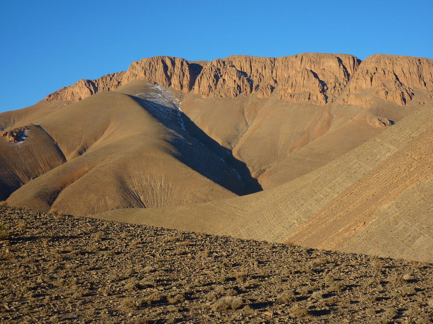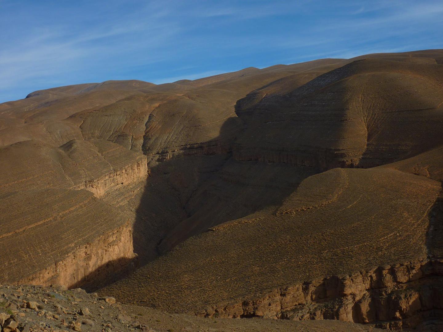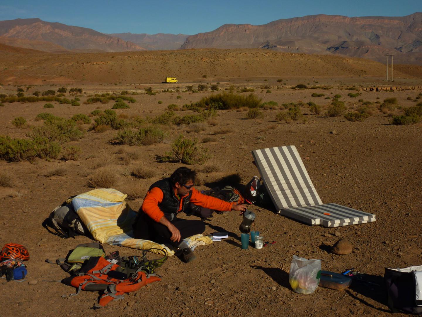 C'est l'occasion de rencontres. ; Ce berger venant vers nous à la nuit tombée septique de la présence de dix légumes dans la poudre d' un sachet de Minut'soup. Là haut sur les flancs du Jbel Ta'abbast il nous montre deux lumières orangées… des feux… des étoiles de berger. La nuit sur les plateaux de l'Atlas, on brule des brindilles, des buissons séchés ; il faut mettre les mains dans la flamme pour sentir la chaleur d'un trop maigre foyer ; on se dispute alors les flancs de la cafetière, sous un festival d'étoiles filantes. Au matin, les lumières de l'Est estompent le givre, puis réchauffent… Nous sommes bien du bon coté de la terre. Nous cherchons à grimper tournés vers le Sud ; voir loin, là où le soleil dessine les courbes des collines, découpe les crêtes, et enflamme les murailles à l'heure des grandes ombres . Les oueds nous ouvrent des corridors pour gagner la paroi… On imagine alors la force de l'eau, la violence des orages de l'Atlas.