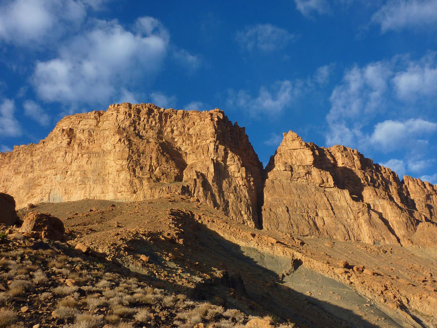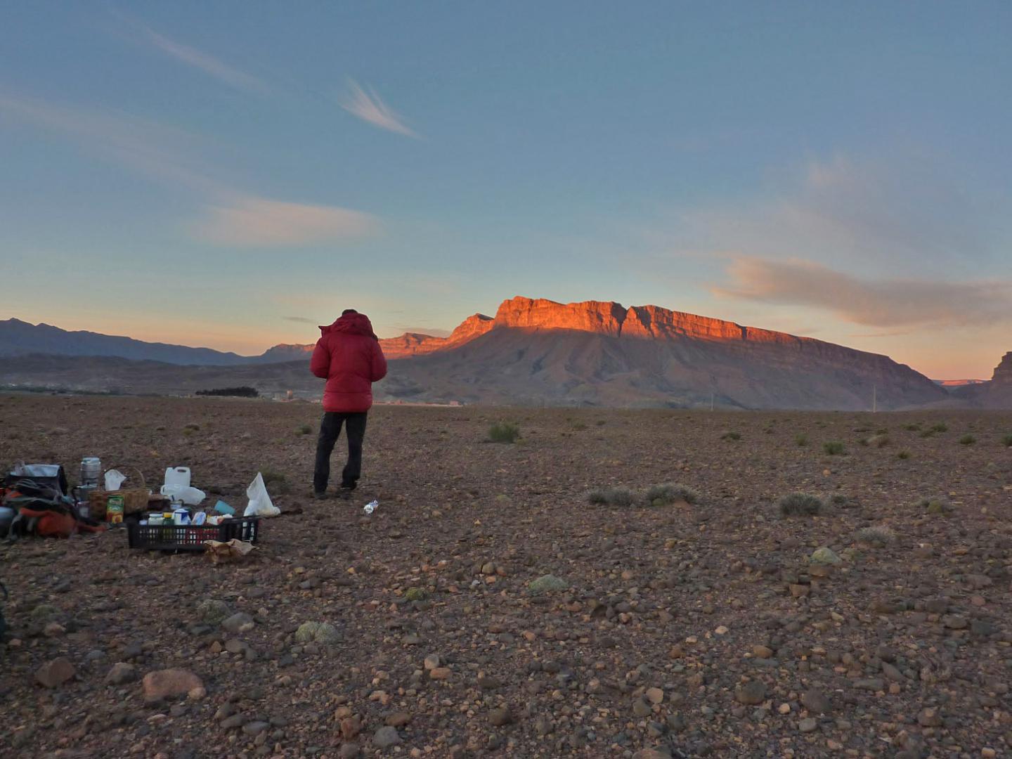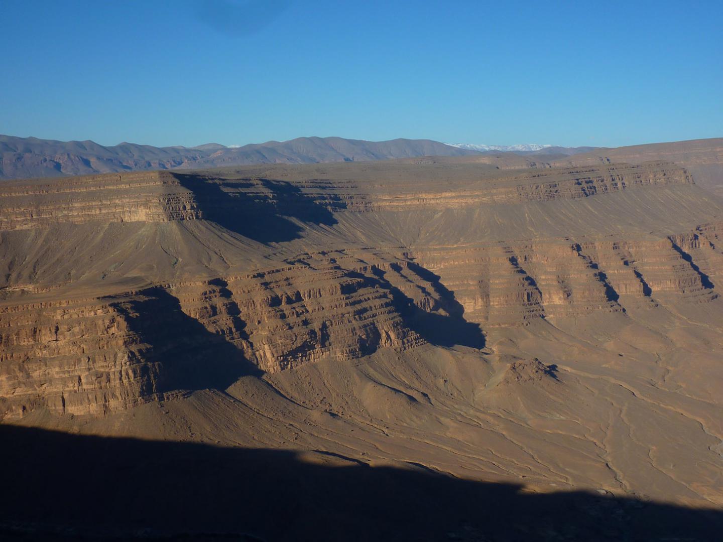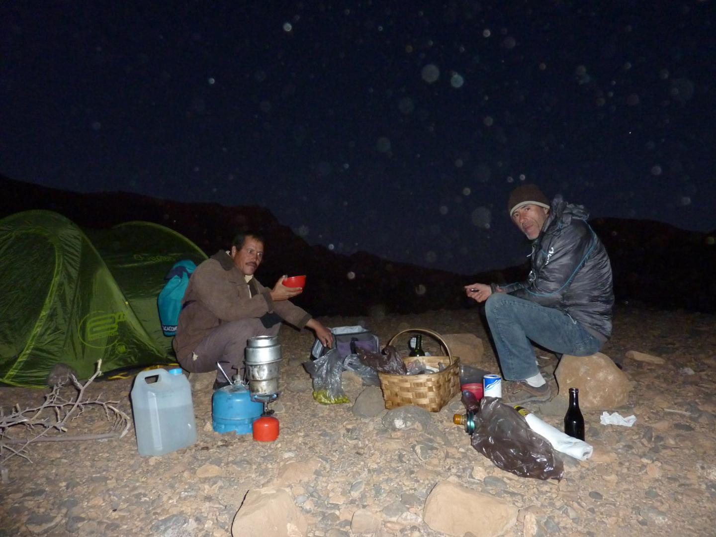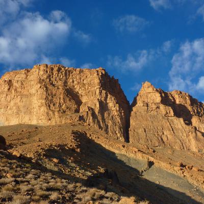 C'est l'occasion de rencontres. ; Ce berger venant vers nous à la nuit tombée septique de la présence de dix légumes dans la poudre d' un sachet de Minut'soup. Là haut sur les flancs du Jbel Ta'abbast il nous montre deux lumières orangées… des feux… des étoiles de berger. La nuit sur les plateaux de l'Atlas, on brule des brindilles, des buissons séchés ; il faut mettre les mains dans la flamme pour sentir la chaleur d'un trop maigre foyer ; on se dispute alors les flancs de la cafetière, sous un festival d'étoiles filantes. Au matin, les lumières de l'Est estompent le givre, puis réchauffent… Nous sommes bien du bon coté de la terre. Nous cherchons à grimper tournés vers le Sud ; voir loin, là où le soleil dessine les courbes des collines, découpe les crêtes, et enflamme les murailles à l'heure des grandes ombres . Les oueds nous ouvrent des corridors pour gagner la paroi… On imagine alors la force de l'eau, la violence des orages de l'Atlas.
