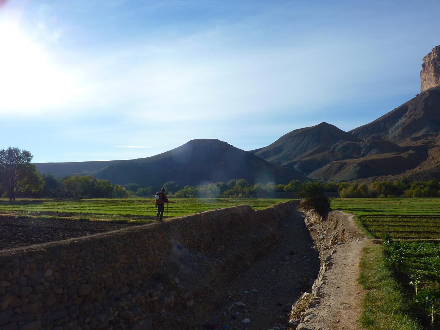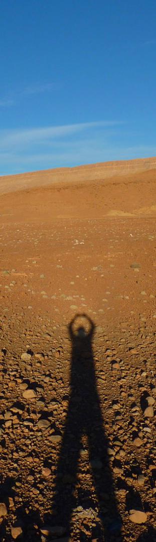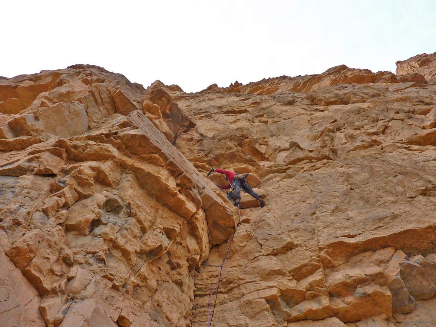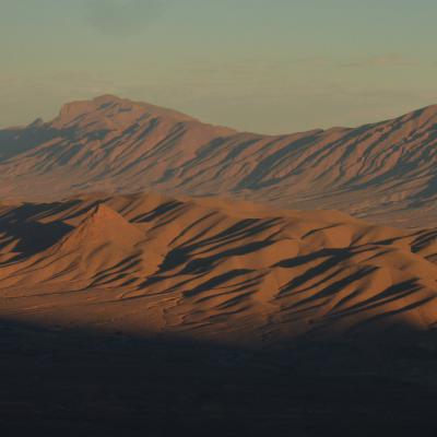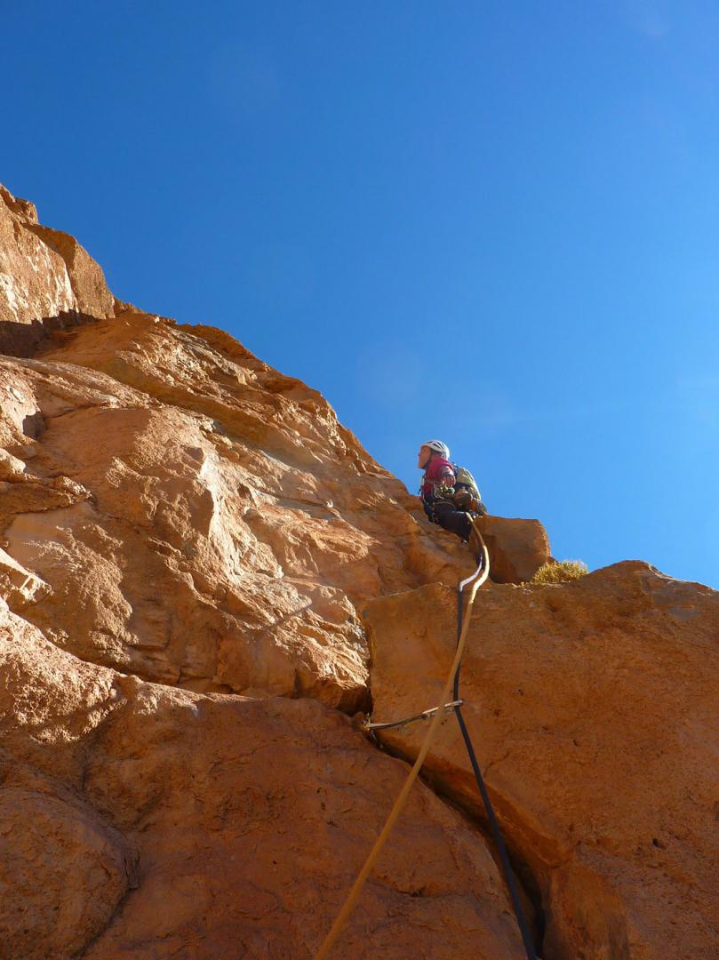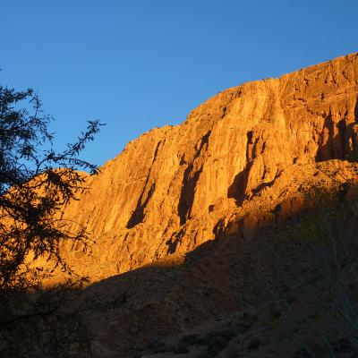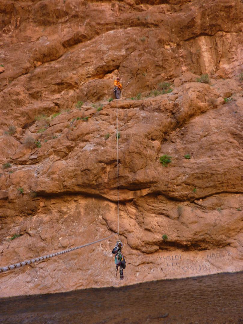 C'est l'occasion de rencontres. ; Ce berger venant vers nous à la nuit tombée septique de la présence de dix légumes dans la poudre d' un sachet de Minut'soup. Là haut sur les flancs du Jbel Ta'abbast il nous montre deux lumières orangées… des feux… des étoiles de berger. La nuit sur les plateaux de l'Atlas, on brule des brindilles, des buissons séchés ; il faut mettre les mains dans la flamme pour sentir la chaleur d'un trop maigre foyer ; on se dispute alors les flancs de la cafetière, sous un festival d'étoiles filantes. Au matin, les lumières de l'Est estompent le givre, puis réchauffent… Nous sommes bien du bon coté de la terre. Nous cherchons à grimper tournés vers le Sud ; voir loin, là où le soleil dessine les courbes des collines, découpe les crêtes, et enflamme les murailles à l'heure des grandes ombres . Les oueds nous ouvrent des corridors pour gagner la paroi… On imagine alors la force de l'eau, la violence des orages de l'Atlas.