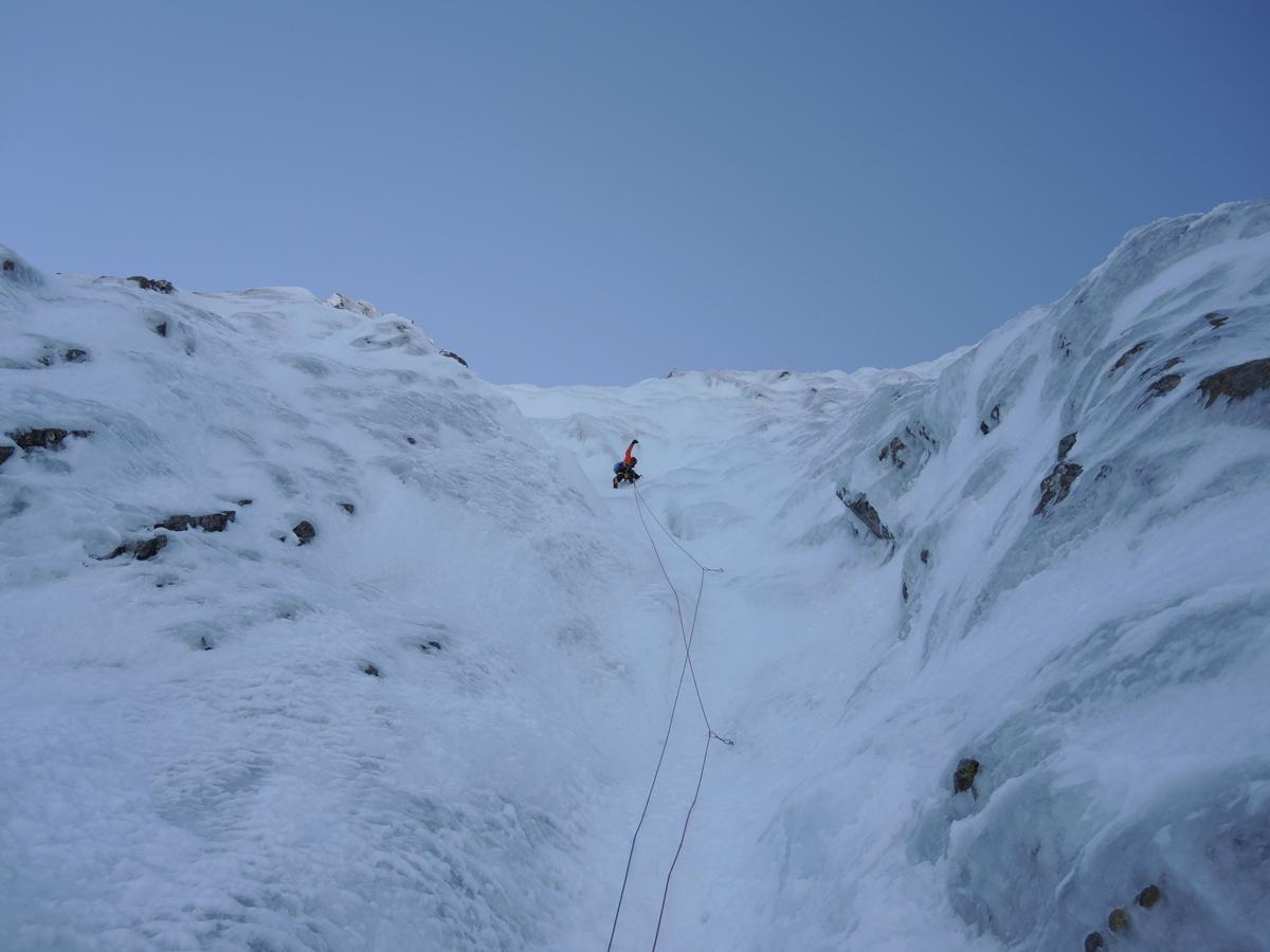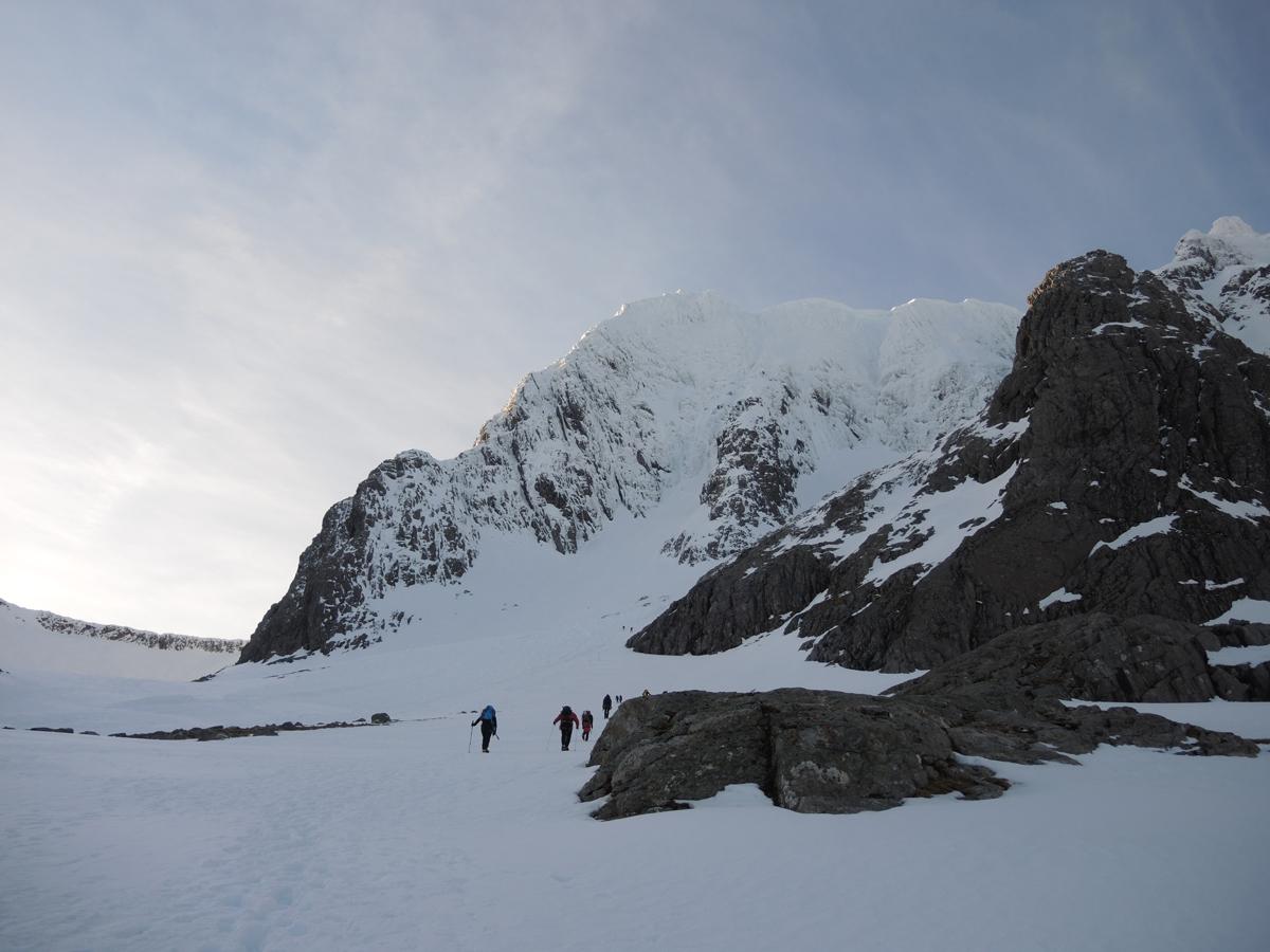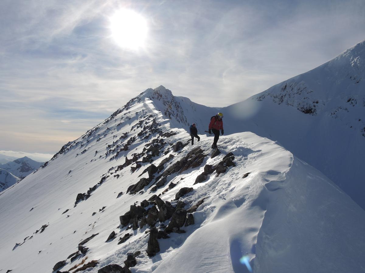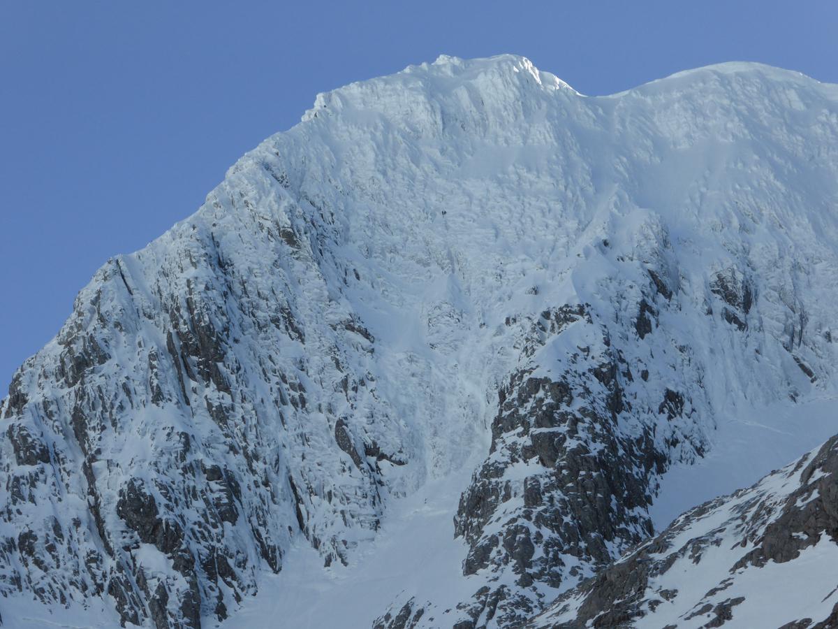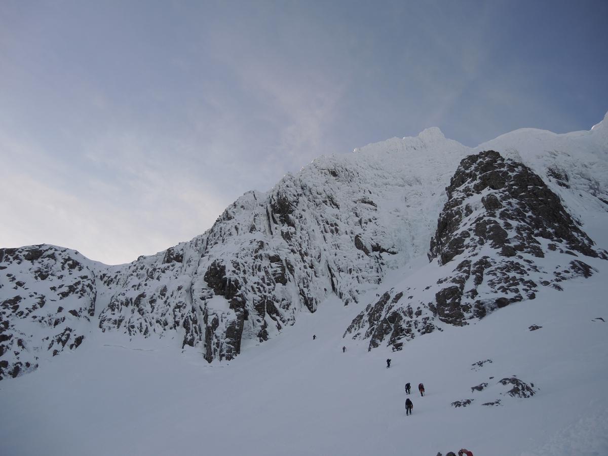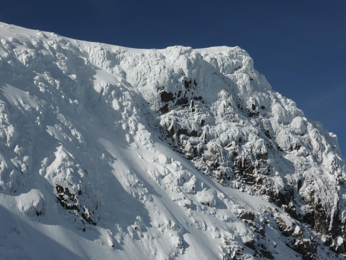En ce début mars 2014 nous cheminons lourdement charger vers le refuge du Ben Nevis. Déjà le soleil tentait d’écarter les nuages, timide encore mais de plus en plus déterminé. La montagne, elle s’était déjà habillé de sa plus belle matière. Elle était de meringue et de gel. Pendant la nuit, les nuages lassés sans doute de s’acharner sur le Ben, capitulent. Trois jours d’un ciel intensément bleu vont nous accompagner pour gouter aux délices de cette montagne. Le jeudi comme pour nous rappeler que nous avions connu l’exception, nous avons retrouvé l’atmosphère humide et opaque du ciel écossais pour descendre plus tard entre les bourrasques qui faisaient chanceler nos charges. Un beau voyage!