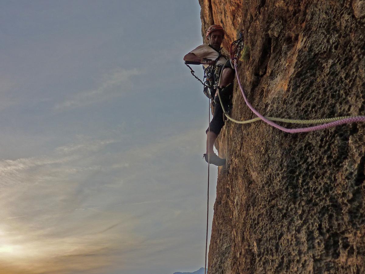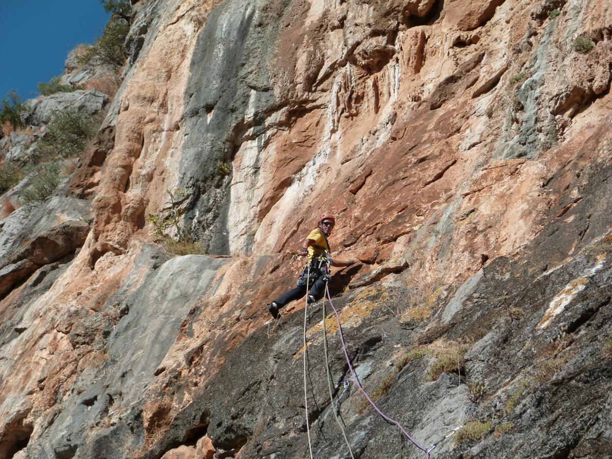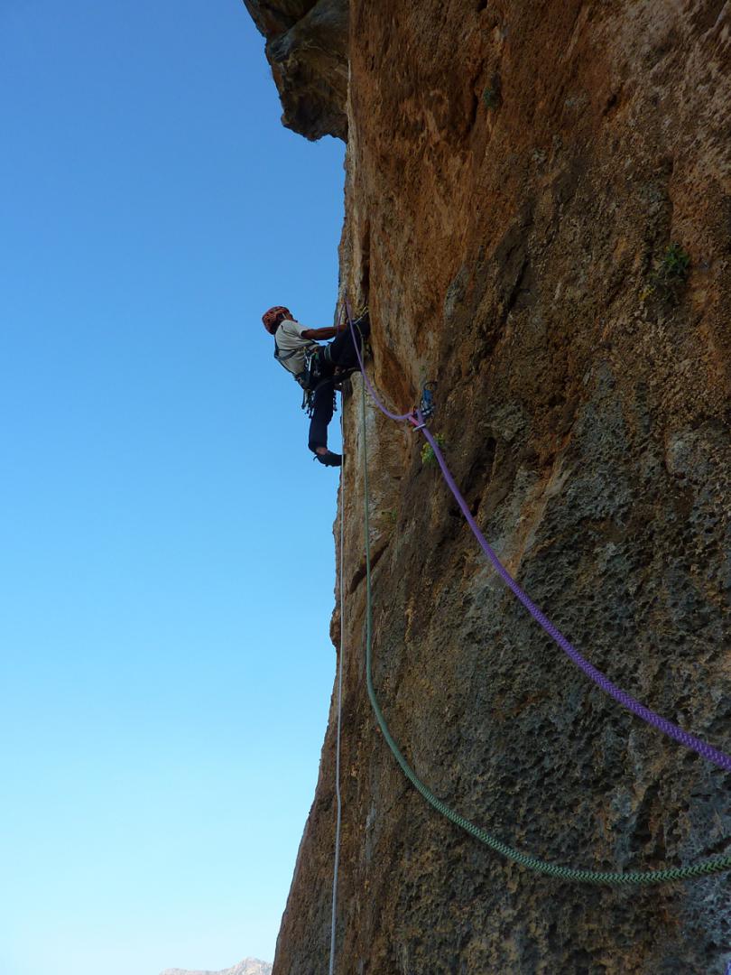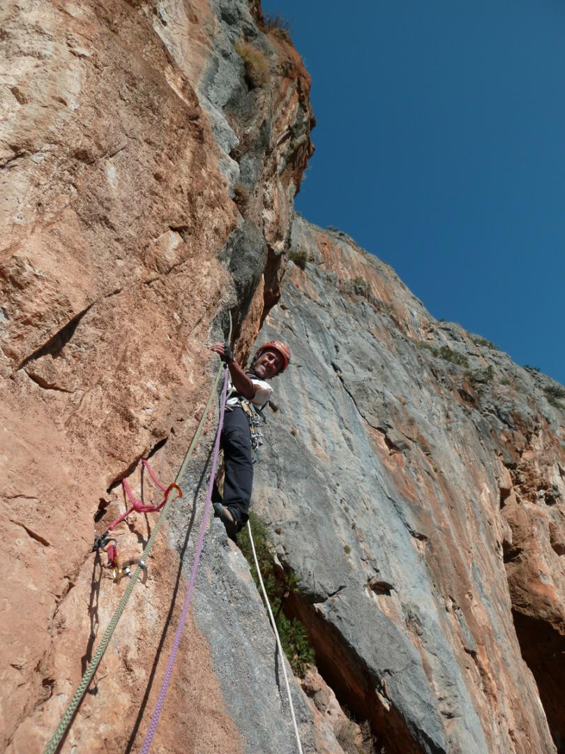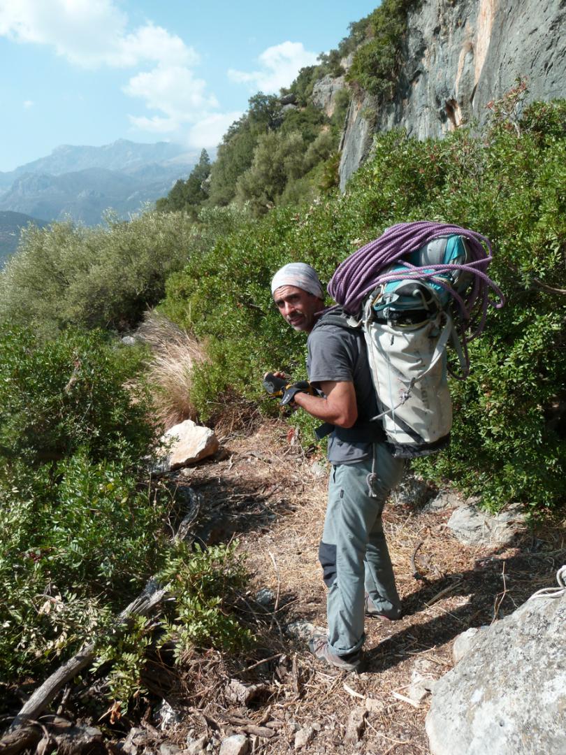 J'ai toujours aimé les montagnes habitées et ici la rencontre avec Abdul, le chef d'orchestre de ce lieu si chaleureux fut un moment fort de notre voyage. Une carrure à la Mohamed Ali, une démarche de grizzli , un air sévère, un air de rifain, qui s'estompe aussitôt que son rire éclate porté par une voix unique rodée et cassée par des nuits trop blanche pour laisser place au sommeil. Abdul aime sa terre et il a envie de voir en elle un autre avenir économique et humain que l'unique manne du Kif… Le "pétrole marocain". Dans cette vallée d'Akchour, l'escalade s'est développé depuis quelques années. De nombreuses petites falaises sont aujourd'hui équipées. Sur la belle et longues paroi de Caïat, quelques voies ont été ouvertes et les possibilités y sont encore nombreuses. Les terrasses du gite d'Abdul sont un observatoire idéal pour révéler, à la faveur des lumières de l'après midi, de nouveaux cheminements. Cette paroi nous allons apprendre à la connaitre, à l'approcher en évitant de se faire lacérer par une végétation souvent sans merci. Alors, enfin, nous allons découvrir ce rocher extraordinairement sculpté qui va nous permettre bien des audaces.