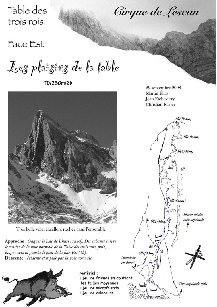 La Face Est de la Table des Trois Rois est un motifs remarquable dans l'arène qui dessine le Cirque de Lescun. en 1961, Paul Bonnenfant, Paul Mortier, Jean et Pierre Ravier et Michel Souverain trouve, en bande(!!) un cheminement astucieux sur cette paroi. en 2008, plus à gauche avec Jean Etcheverry et Martin Élias, nous en avons trouvé un autre, très beau et en excellent rocher