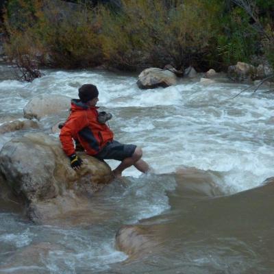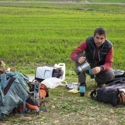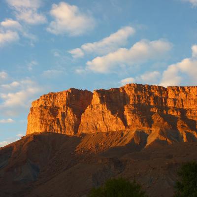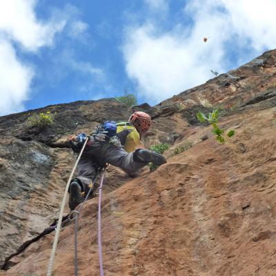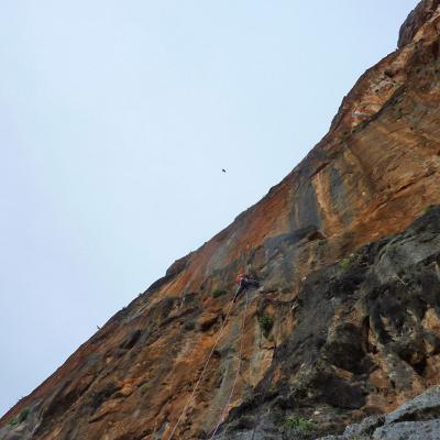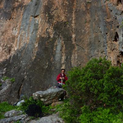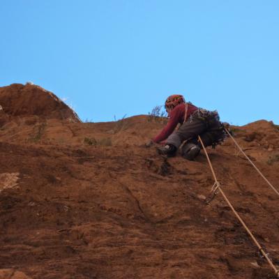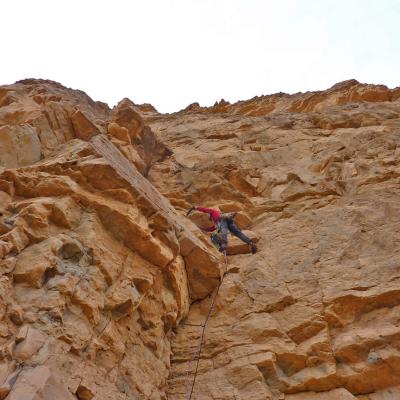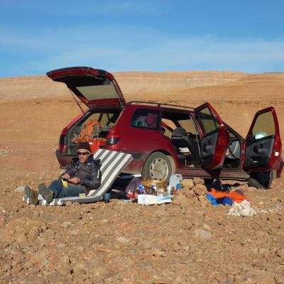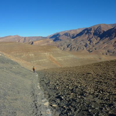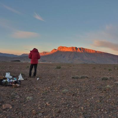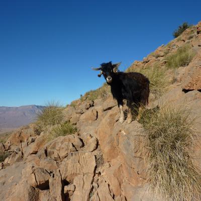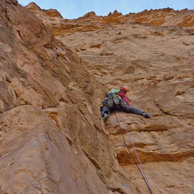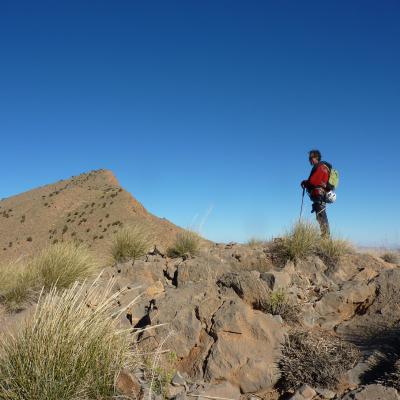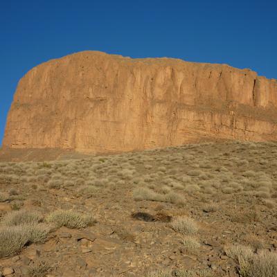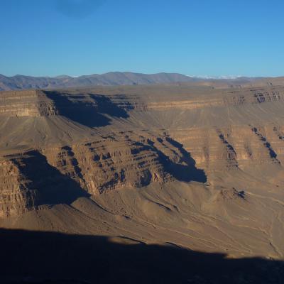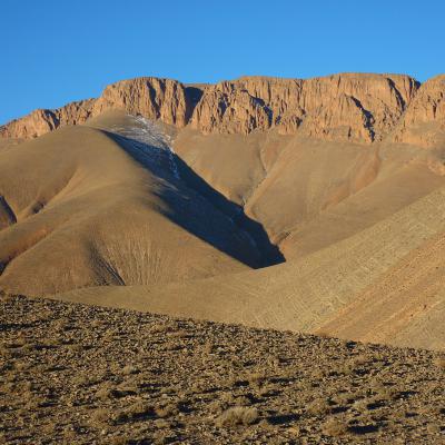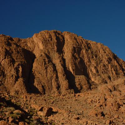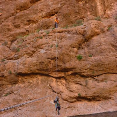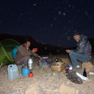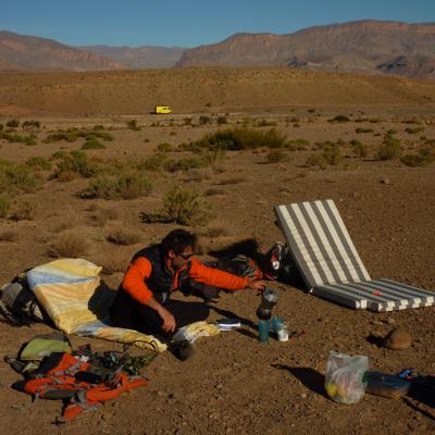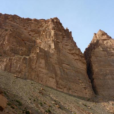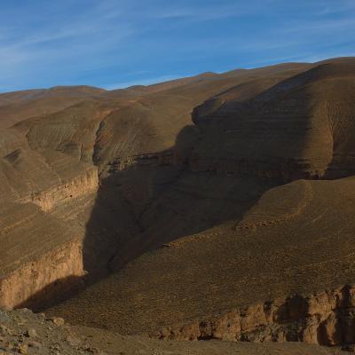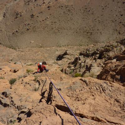 C'est l'occasion de rencontres. ; Ce berger venant vers nous à la nuit tombée septique de la présence de dix légumes dans la poudre d' un sachet de Minut'soup. Là haut sur les flancs du Jbel Ta'abbast il nous montre deux lumières orangées… des feux… des étoiles de berger. La nuit sur les plateaux de l'Atlas, on brule des brindilles, des buissons séchés ; il faut mettre les mains dans la flamme pour sentir la chaleur d'un trop maigre foyer ; on se dispute alors les flancs de la cafetière, sous un festival d'étoiles filantes. Au matin, les lumières de l'Est estompent le givre, puis réchauffent… Nous sommes bien du bon coté de la terre. Nous cherchons à grimper tournés vers le Sud ; voir loin, là où le soleil dessine les courbes des collines, découpe les crêtes, et enflamme les murailles à l'heure des grandes ombres . Les oueds nous ouvrent des corridors pour gagner la paroi… On imagine alors la force de l'eau, la violence des orages de l'Atlas.